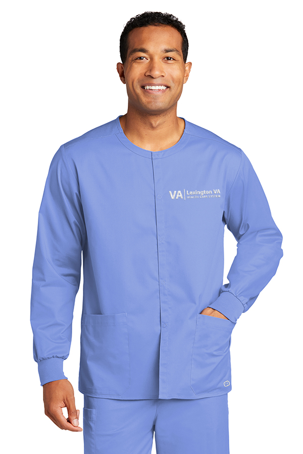 Description Wonderwink unisex work flex snap-front scrub jacket. 65/35 poly/cotton, 5 snap front closure, top loading front pockets with interior pocket, rib knit cuffs, classic fit.