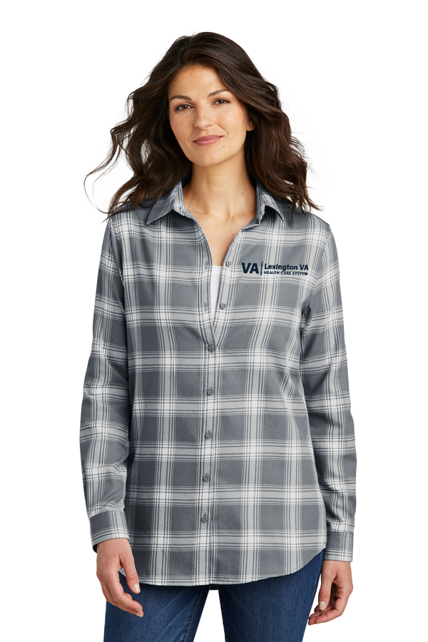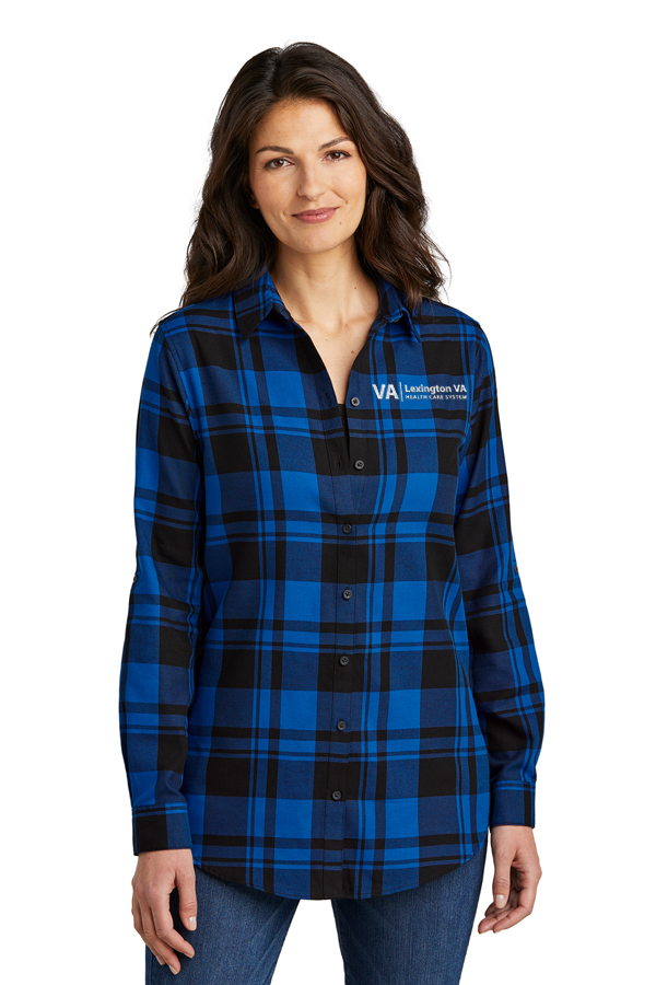 Ladies Flannel Shirt LW668 Port Authority Ladies Plaid Flannel Tunic. 4.4-ounce 60/40 cotton/poly flannel. Lightly brushed for softness, longer tunic length, open collar, and roll sleeves with button tabs.