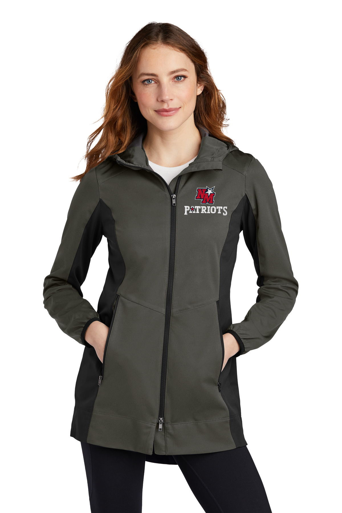 Ladies Lightweight Soft Shell JacketL719Port Authority Ladies Active Hooded Soft Shell Jacket. 100% polyester knit shell bonded to a water-resistant film insert and a 100% polyester mesh interior. 1K/1K waterproof/breathability rating, longer length for additional coverage, three-panel hood with adjustable locking drawcord, front zippered pockets, and open drop tail hem.