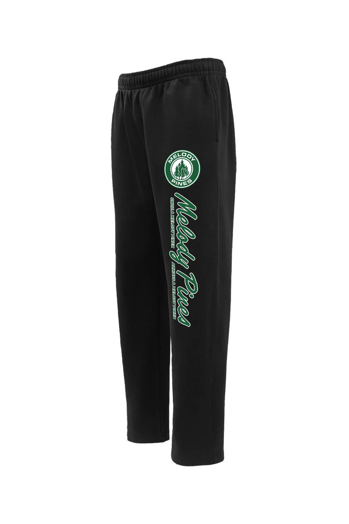 Left-leg printed with Melody Pines "Once a Melody Piner..." logo