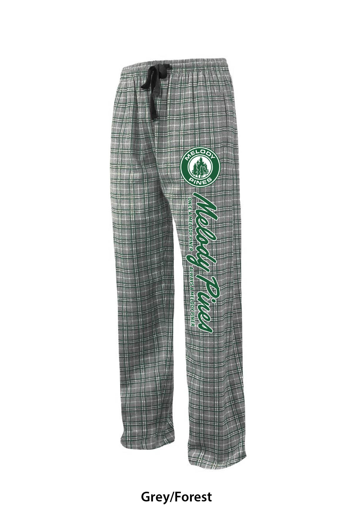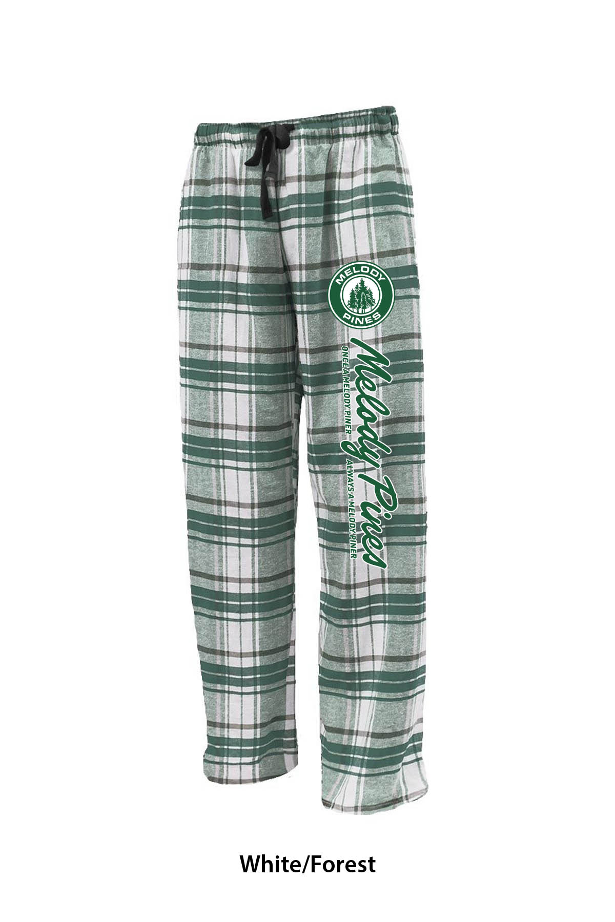 Left-leg printed with Melody Pines "Once a Melody Piner..." logo